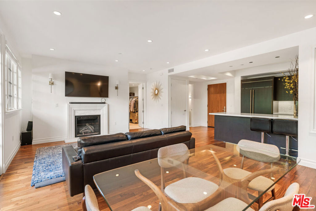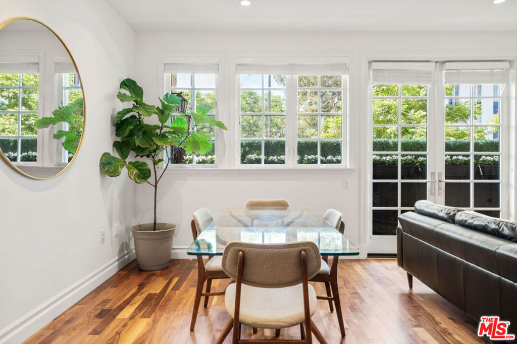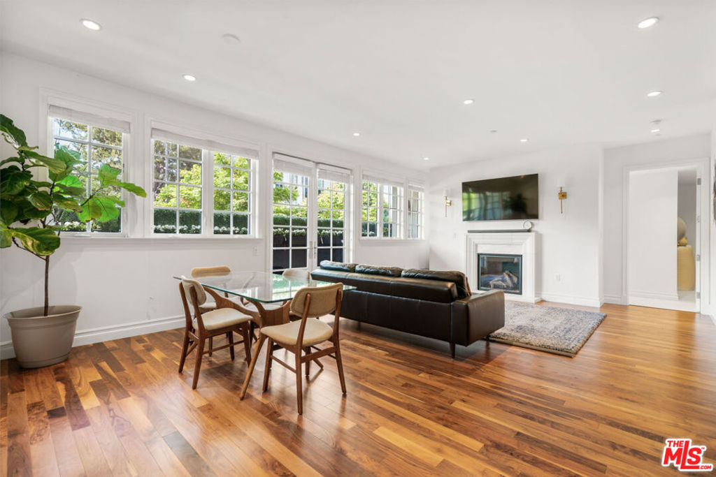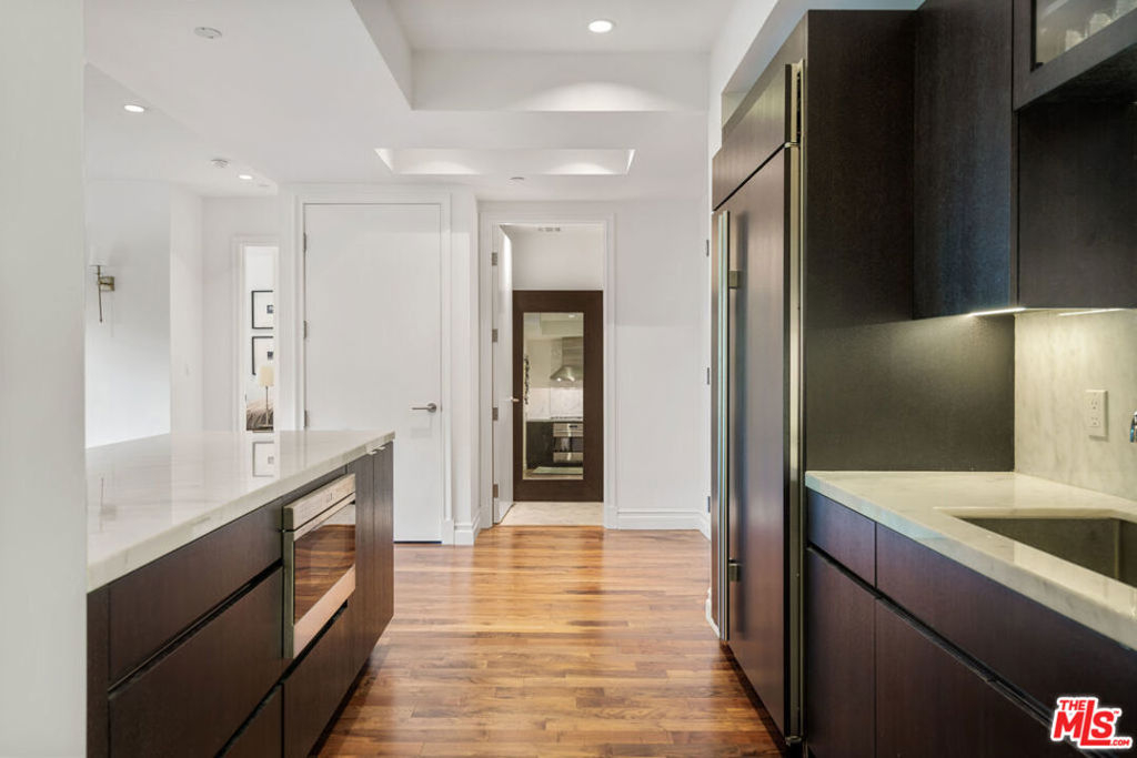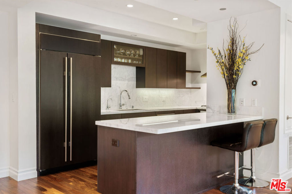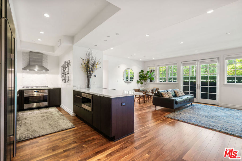 Stunning Spanish Contemporary condo located in Hancock Park. As you enter, you will immediately notice the elegant wood flooring, 9ft ceilings, and a spacious open floor plan with French doors that lead to a private patio. Natural lights flood the unit through the numerous south-facing windows. The gourmet chef's kitchen features dark wood cabinetry and white stone countertops for a sleek look with a Wolf range and oven, Sub-Zero fridge with matching dark cabinet facade, and built-in microwave. Enjoy informal meals at the breakfast bar and entertain with friends in the open living and dining areas. The two-bedroom suites are separated on opposite sides of the unit for complete privacy. Each bedroom has an en-suite bath and a generous walk-in closet. Tastefully appointed bathrooms feature white marble countertops, tiles, and oversized showers plus an additional powder room near the entryway. In-unit washer and dryer. Two separate parking spaces in the secure gated garage. Added bonus is a private storage room that comes with this home. This is the home you have been waiting for!