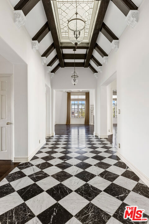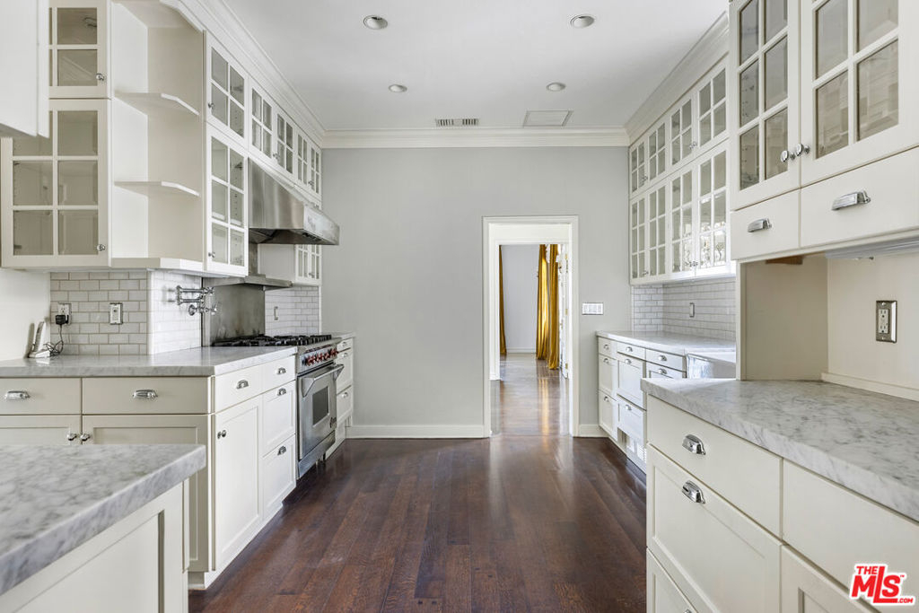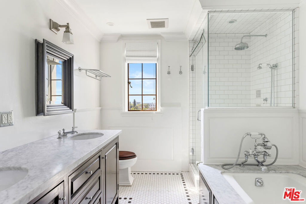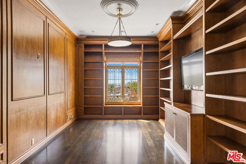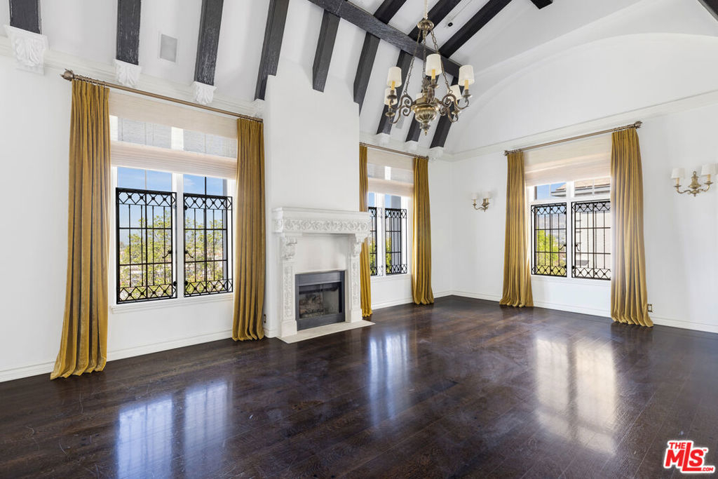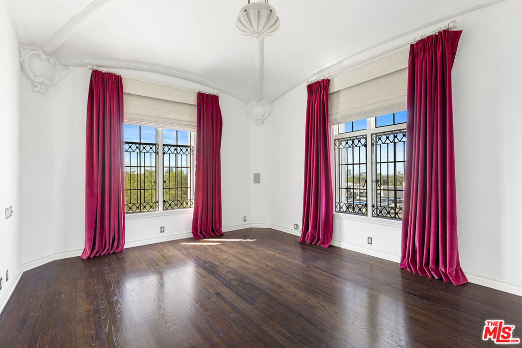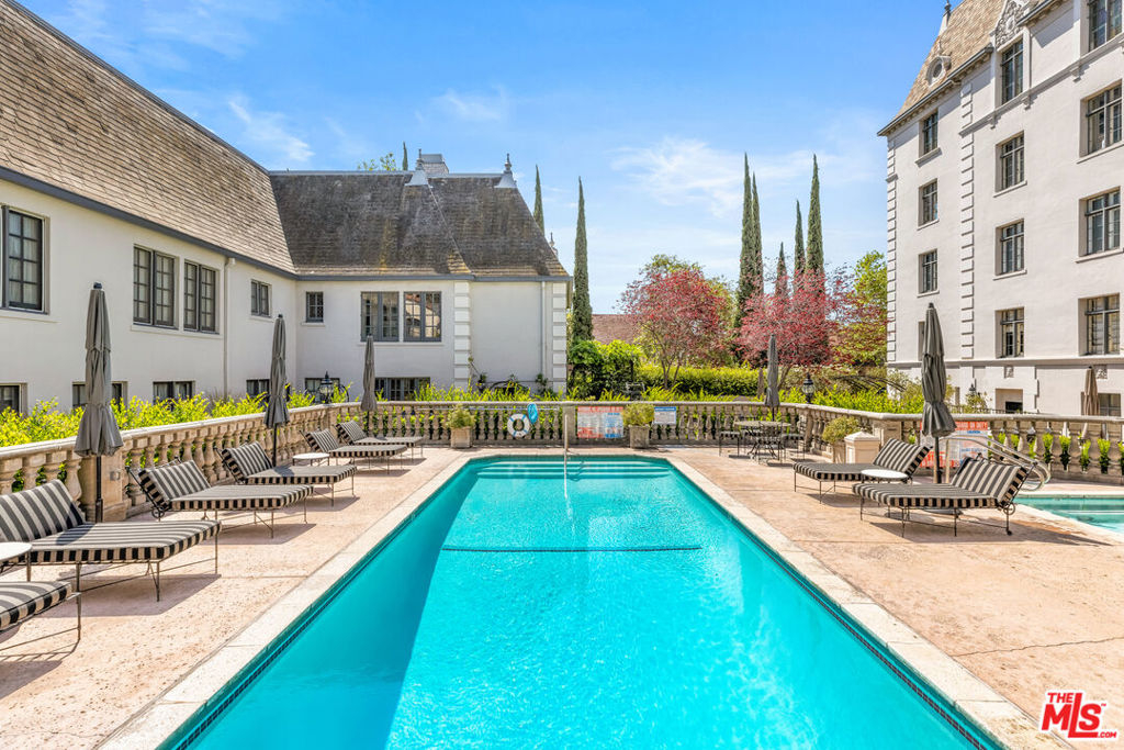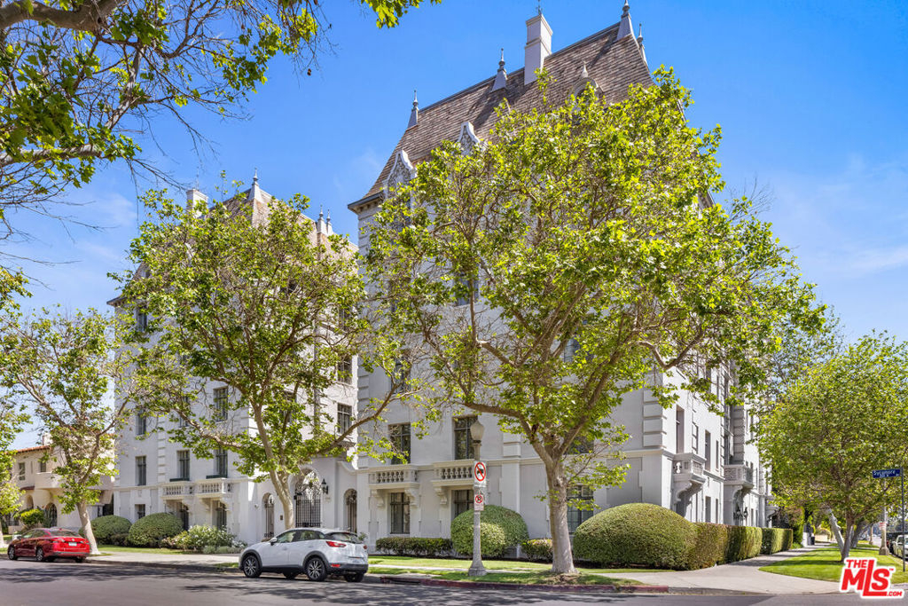 Exquisite Penthouse in the legendary Faubourg St. Denis, built in 1928 by Golden Age architect James N. Conway. A rare offering on the 5th floor of this historic French Normandy style building, corner unit boasts South/West views and exceptional period details. Dramatic and bright as you enter through a 28-foot-long foyer with custom marble floors, vaulted beam ceiling w/skylight and open to all the main rooms. An elegant living room features hardwood floors, stone fireplace, steel casement leaded windows, 14-foot ceilings, and French Doors that open to a formal dining room. Large gourmet kitchen with marble counters, custom cabinets, and top of the line appliances. Primary Suite w/private foyer, ample closet space, luxurious bath with dual sinks, soaking tub and separate shower. An additional guestroom with en suite bathroom, sitting area, a wood paneled library with built-in bookcases (that is an optional 3rd bedroom). Utility room with work space, laundry, and prep kitchen, with a separate service entrance. Building amenities include on site manager, double gated entry, gated garage, gym with sauna and gorgeous pool & spa area. Truly one of the most beautiful Penthouse units available in Los Angeles.