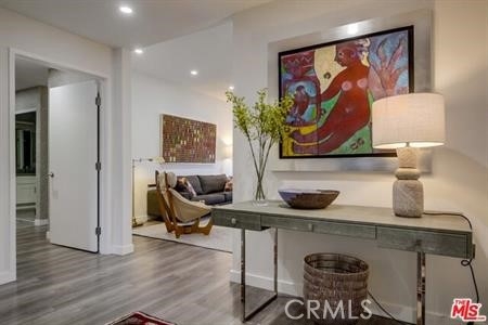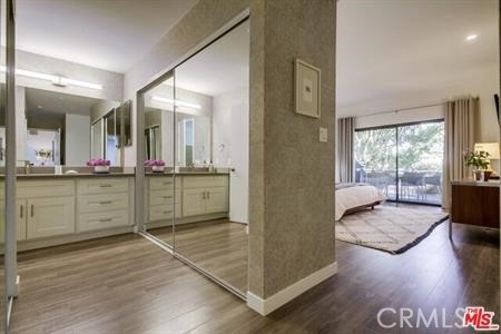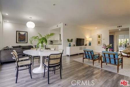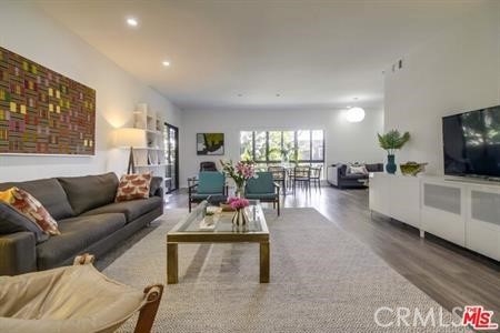 Premier and safe condominium in a guard gated community in Hancock Park with large one bedroom and huge open spaces ~ living, family & dining room ~ upgraded kitchen & 1.5 bathrooms. East facing unit in sought after Hancock Park Terrace guard monitored complex. Elegant entry flows to huge living room with 2 seating areas and dining space. Beautifully upgraded laminate flooring and LED lighting throughout. Enjoy a morning coffee as tree dappled sunlight streams into the living areas and private deck. Upgraded galley style kitchen with stainless appliances. Upgraded powder room, plus laundry closet. Master bedroom suite includes multiple closets with a walk-in that could double as an office; Remodeled bath with separate tub and shower plus vanity area. Generous Master bedroom overlooks private deck. Move right in! Extra community storage space on this floor. Year 'round heated pool and spa! Dues also include basic cable and HBO. A Gorgeous sanctuary!