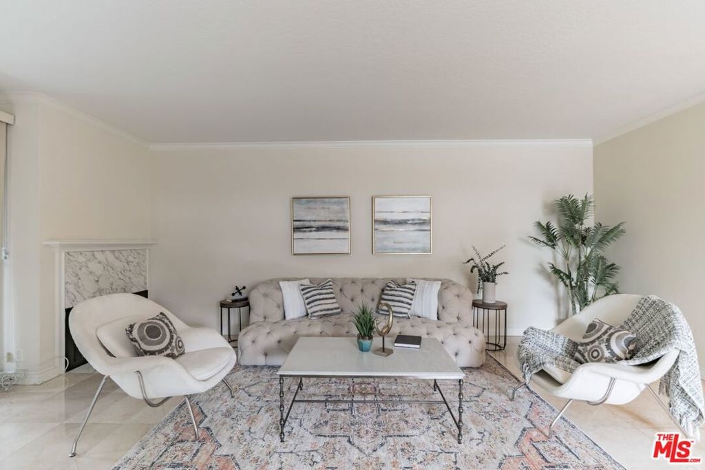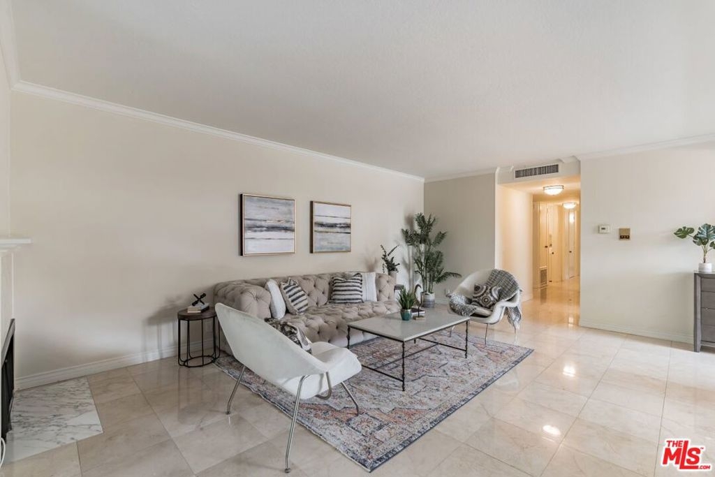 Beautiful & spacious condo located in prestigious Hancock Park. This Corner unit is elevated above street level w/views of Wilshire Blvd. It has a very open floor plan & gorgeous marble flooring throughout the living areas. The living room has a gas fireplace and opens to a large dining area. The den which can also be used as a 3rd bedroom, office or gym, has a built-in desk & bookcase w/direct access to the covered patio. The remodeled galley kitchen has Caesarstone Quartz Counter Tops, glass tile back splash, custom cabinetry and stainless steel appliances. Both master suite w/walk-in closet and 2nd bedroom have their own private baths. The laundry room inside the unit includes a washer and dryer. Unit has side by side parking spaces and a storage unit. Amenities include 24hrs security parking, pool, spa, gym and women's and men's sauna. Property being sold in "As IS" Condition.