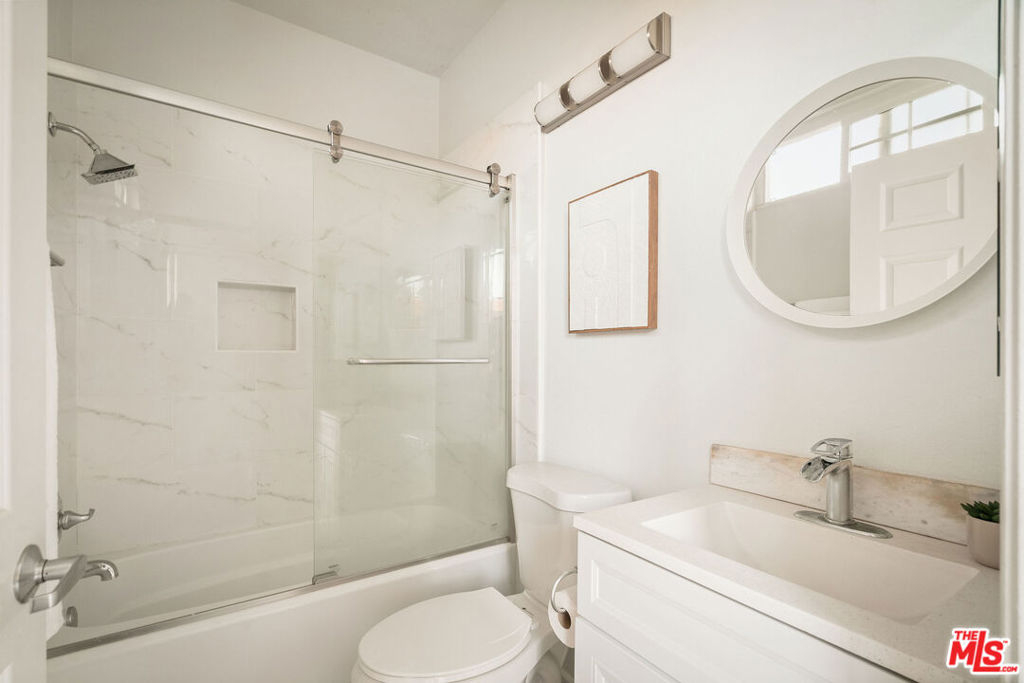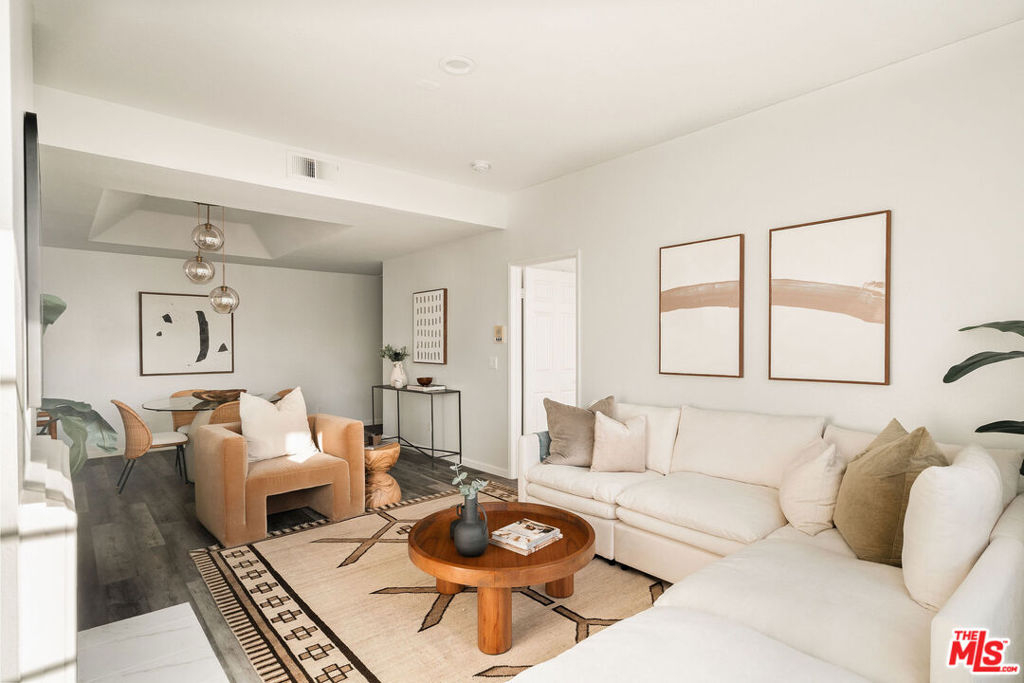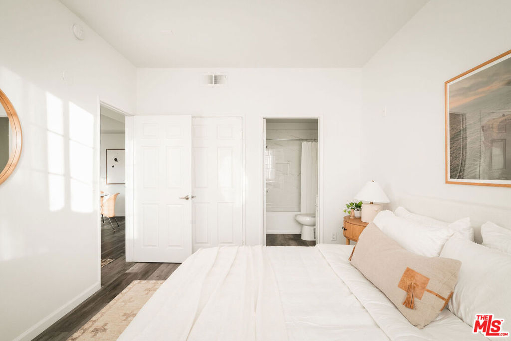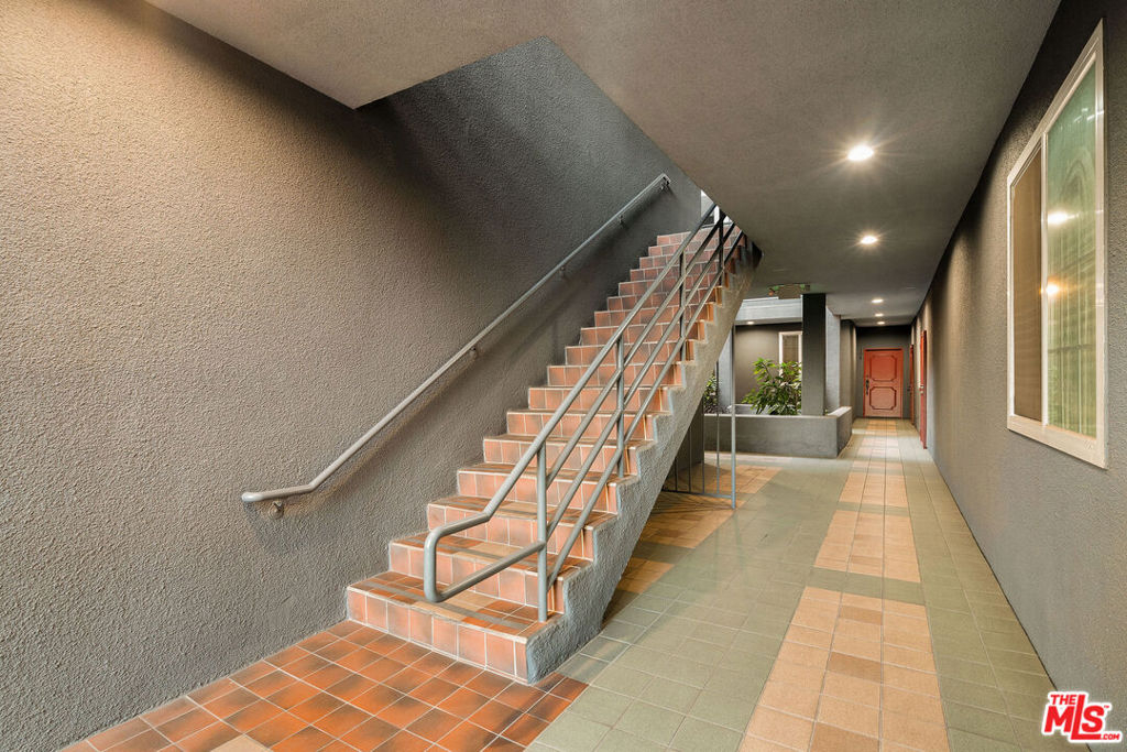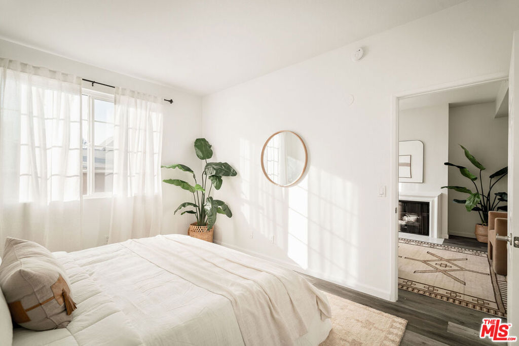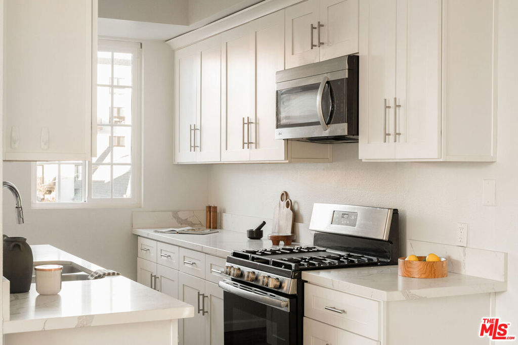 This charming condo is situated in a residential neighborhood, offering a serene atmosphere while remaining close to all the essentials. Step inside to discover a beautifully renovated, freshly painted two-bedroom, two-bathroom unit that boasts high ceilings and a modern design. The spacious living room features a fireplace as its focal point, while the open-concept floor plan blends the kitchen, dining, and entertaining areas, creating an ideal space for gatherings. The kitchen is a true highlight, equipped with sleek Quartz countertops, stainless steel appliances including a stove, dishwasher, microwave and ample storage. Natural light pours in through the kitchen window, providing a subtle glimpse of the iconic Hollywood Sign in the distance. Both bedrooms are generously sized and en suite, each offering a large walk-in closet. The bathrooms are equally impressive, showcasing contemporary finishes such as Delta bathtubs and stylish track glass shower doors. Additional amenities include central air conditioning, a gated security garage with two tandem parking spaces, an on-site gym, and a laundry room for added convenience. Ideally located near Larchmont Village and other desirable spots, this home provides the perfect blend of comfort, style, and accessibility.
