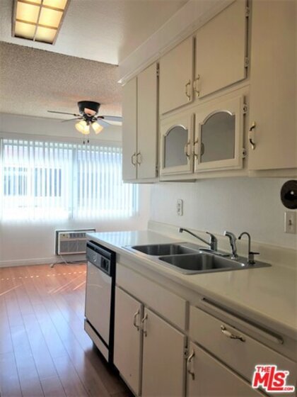 Top floor condo at Sycamore Villas with balcony to the courtyard, facing south. The unit features an open floor plan with a living room, dining room and kitchen, and a spacious 1 bedroom/1 bath. Laminate hardwood floors, lots of closet space. The unit has 1 covered parking space in the subterranean garage. Building has newer roof, copper pipes, heated pool and sauna, recreation room, large laundry room, earthquake insurance, and 24 hour security access. Building is FHA approved.