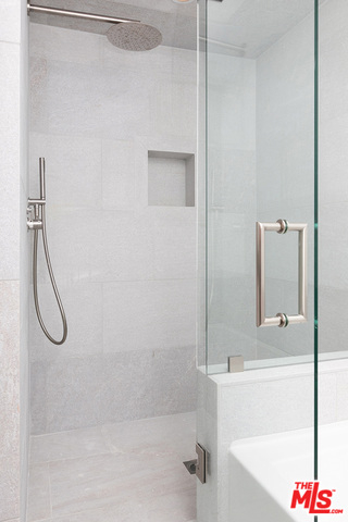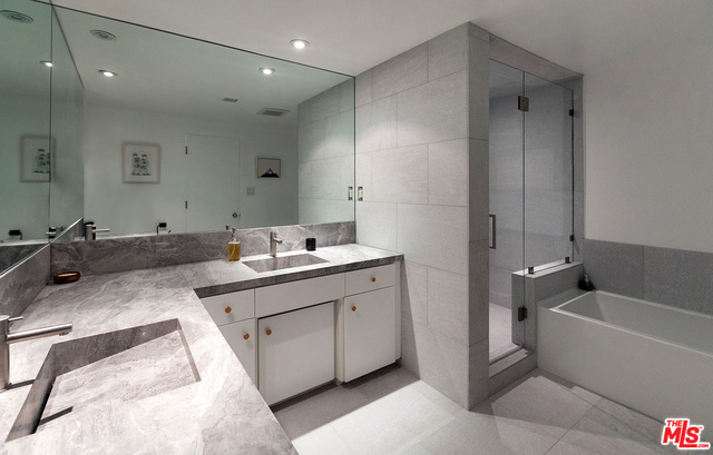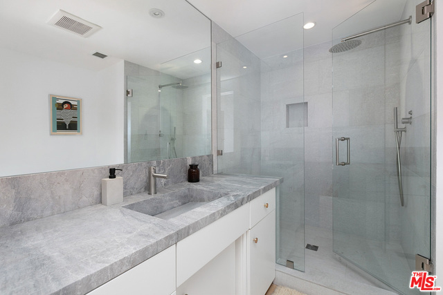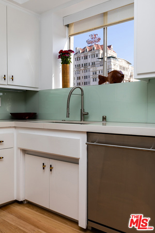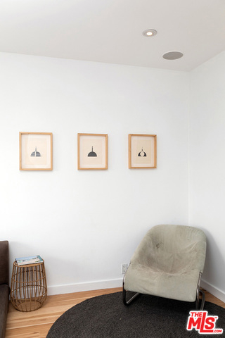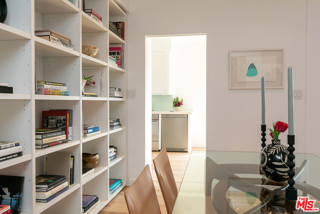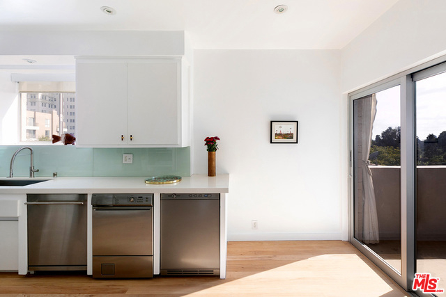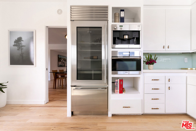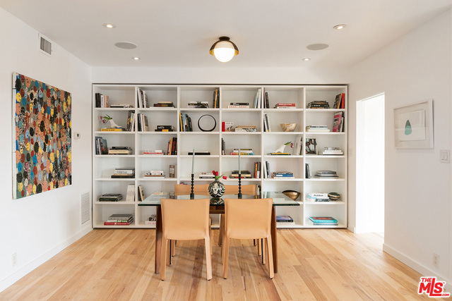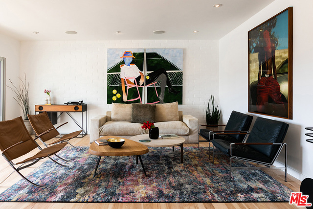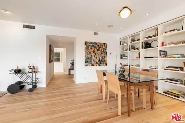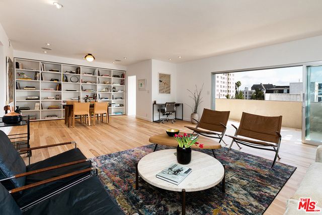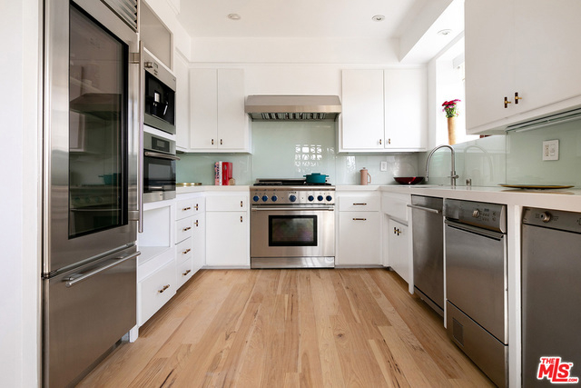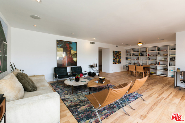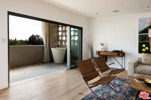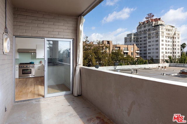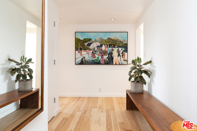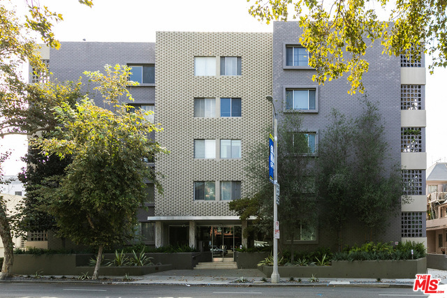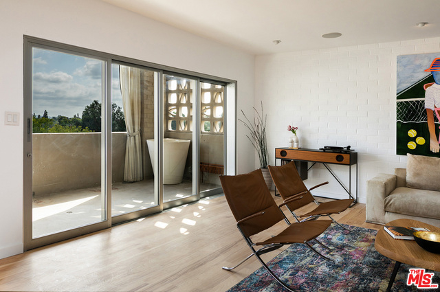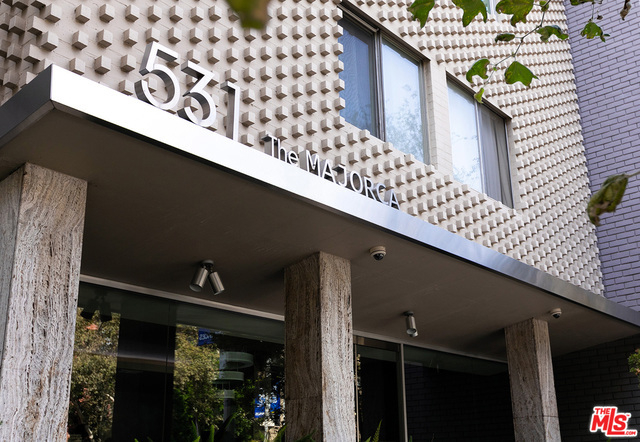 Sophisticated and spacious rear corner unit in the mid-century Majorca of Hancock Park, walking distance to Larchmont Village and Melrose. Bright and light-soaked single story floor plan featuring hardwood flooring, recessed lighting, built-in sound system, with balcony and views of El Royale, tree tops, and the Wilshire Country Club. Elegant and enormous great room has retractable floor-to-ceiling glass doors, floor-to-ceiling bookshelf, and feature wall with mid century brick facade. Contemporary kitchen has quartz countertops, built-in espresso machine, high-end appliances, and room for a breakfast nook. Large master suite with en suite bathroom, and both bedrooms feature large windows with tree top views. Remodeled bathrooms feature rain showers and stone countertops. Washer and dryer in unit, comes with two dedicatedparking spots in the garage, and located in the quiet southwest corner of the building with only one neighbor.