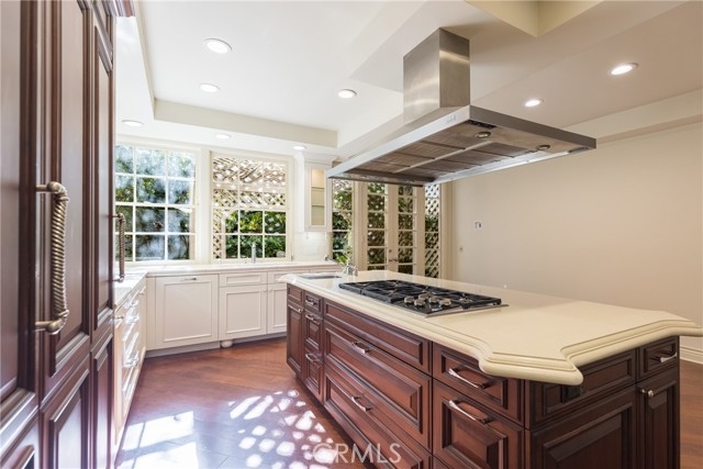 This exceptional 3-bedroom, 4-bathroom 4,018 square foot corner townhome delivers resort-style living in the highly desirable guard-gated Ridge area of Mountain Gate in Brentwood Hills. Located in a very secluded area with 24 hr. security and unmatched serenity. Stanley Kramer, American Film Director, was the original owner of this property set behind a private iron gate with a beautiful courtyard offering complete privacy with only one common wall. This lavish home boasts a formal entry, dramatic staircase, expansive living room with fireplace, wet bar, soaring vaulted ceilings, floor-to-ceiling luminous windows, and elegant French doors displaying a well-manicured wrap-around yard and patios that are perfect for entertaining or quiet relaxation in a zen-like atmosphere with mature trees and koi pond. Spacious eat-in kitchen featuring Miele refrigerator, Wolf dual-convection ovens, Bosch dishwasher, two walk-in pantries and center island. The kitchen has easy access to the formal dining and living areas. One bedroom with ensuite bathroom is conveniently located on the first floor. Additional highlights include a library with fireplace and its own private patio, a dedicated laundry room and a double-attached garage with direct access to the home. Upstairs, retreat to an over-sized luxurious primary suite with a sitting area and a private Juliet balcony with tree-lined views. A huge spa-like bath offers a soaking tub, dual vanities, and a separate shower and bidet. Separately located upstairs is a private 2nd bedroom that has easy access to a full bath. The HOA includes community Pool/Spa, Trash Valet, exterior EQ and Fire Insurance as well as roof coverage. You will have the option to join Mountain Gate Country Club that offers golf, tennis, spa and dining. Easy 405 Freeway access, shopping, dining & spectacular hiking trails. Enjoy the tranquil, resort-like lifestyle and make this stunning colonial-style home yours. Call for a private showing.