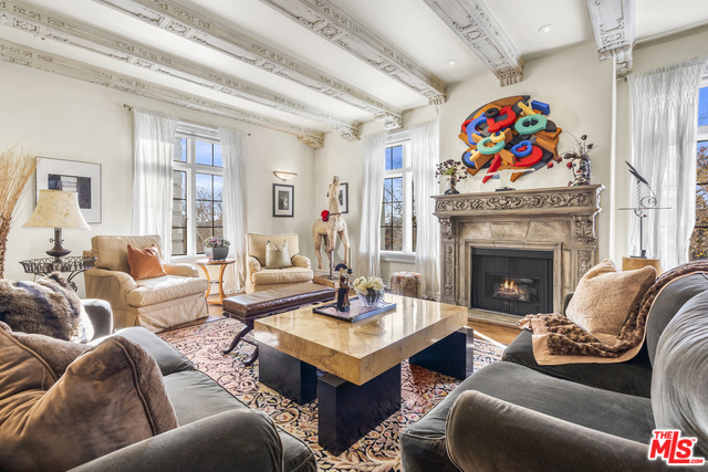 Stunning 4 bedroom North West corner apartment in the legendary 1920's Faubourg St. Denis Bldg. Incredible details include 28ft entry hall with carved beam ceilings, large formal dining room, large scale elegant Living room with high ceilings, stone fireplace, steel frame windows overlooking trees and entry courtyard area.Expansive art walls, recessed lights, hardwood floors, chef's eat in kitchen with top appliances. Master suite with custom built in bookcases, cabinetry, walk in closet and remodeled bath.2 additional bedrooms plus maids/office/bath with separate entry. Building amenities include on site manager, double gated entry, gorgeous pool and spa, gym/sauna, storage room and gated parking.