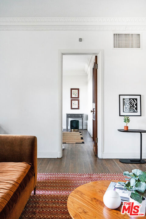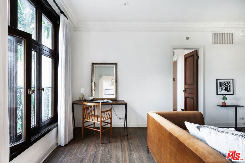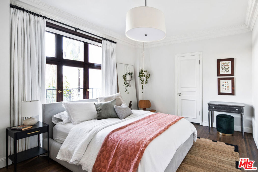A rare find, this Country Club Manor pied-a-terre is an elegant and sophisticated respite in the sky. Built in 1926 by renowned Architect Leland Bryant, this French Normandy style masterpiece is regarded as the finest and most sought-after full service buildings in all of Los Angeles. Meticulously updated, this 1 bedroom, 1 bath unit radiates elegance and luxury. Enter to find a bright and spacious living room with original hardwood floors, custom built-ins and crown molding, and head-on views of downtown LA. The attached kitchen has been highly upgraded with custom cabinetry, carrera marble counters, Viking stove, and Sub-Zero refrigerator. Separated from the living spaces, the bedroom is a cozy yet spacious retreat with walk in closet and attached bathroom that features beautiful Heath Ceramic Tile. The building offers 24/7 doorman & valet parking services and stunning grounds with hot tub and communal relaxation spaces. Situated in the heart of prestigious Hancock Park, across from The Wilshire Country Club, and just steps away to charming Larchmont Village, this home is the perfect place to center your life in Los Angeles.