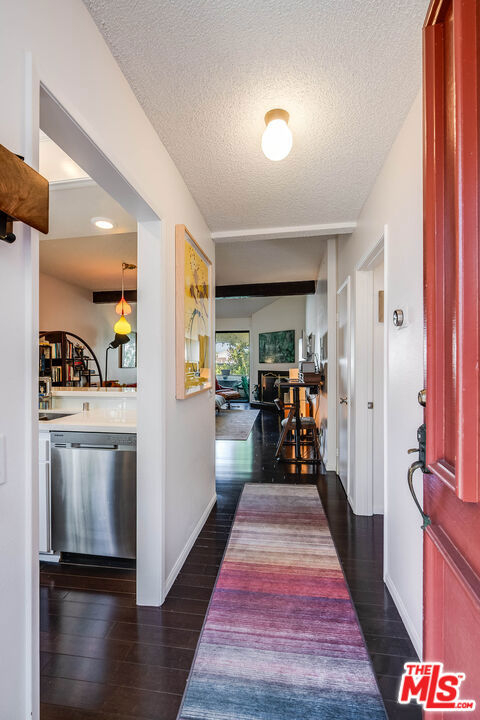 If you've been searching for a Hollywood Hills condo that feels tucked away but still close to everything, this top-floor corner unit delivers. Located in the desirable Toluca Hills community, this end-unit residence sits in a lush hillside setting just above Hollywood and offers rare privacy with only one shared wall and a rear elevator for added convenience. It truly feels like a retreat in the trees while still being minutes from Universal Studios, Warner Bros., Disney, and the Hollywood Bowl. Inside, vaulted ceilings in both the living room and bedroom create an open, airy feel. The layout flows naturally from the updated kitchen into the dining and living area, complete with fireplace and access to a private balcony surrounded by greenery. The kitchen features quartz countertops, glass tile backsplash, stainless Samsung appliances, recessed lighting, and generous cabinetry. Dark bamboo floors run throughout. The remodeled bathroom includes a sleek walk-in shower and separate vanity area, and the bedroom offers excellent storage with a true walk-in closet. Central heat and air plus two tandem parking spaces add everyday convenience. Residents of Toluca Hills enjoy a pool, spa, mature landscaping, and direct access to hiking trails leading to Lake Hollywood and Griffith Park. HOA dues also include earthquake insurance along with water, sewer, and trash. Ideally located near Toluca Lake and the Burbank Media District, with quick access to the 134, 101, and 5 freeways, this is a rare opportunity to own a private, top-floor condo in one of LA's most central locations.