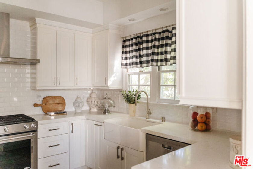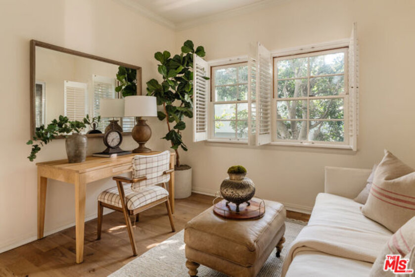 Experience elevated Brentwood living in this beautifully renovated, front-facing 2-bedroom, 2-bath residence, ideally situated in an intimate 9-unit building. Positioned with a desirable west-facing exposure, the home is filled with natural light and offers a serene, tree-lined outlook.A formal entry opens to a spacious, open-concept living and dining area defined by soaring ceilings, recently refinished wide-plank wood flooring, and a statement fireplace. Oversized glass door leads to a generous private balcony, creating a seamless indoor-outdoor flow ideal for both relaxed everyday living and effortless entertaining. Thoughtfully curated finishes and soft, layered textures evoke a timeless, understated elegance reminiscent of a classic Nancy Meyers aesthetic. The chef's kitchen is both refined and functional, featuring premium stainless steel appliances, custom cabinetry, and sleek quartz countertops, with open shelving that adds warmth and character.The expansive primary suite offers a true retreat, complete with a large walk-in closet and a spa-inspired bath with dual vanities and a frameless glass shower. A well-appointed secondary bedroom and full bath with tub provide flexibility for guests, office, or additional living space. Additional highlights include side-by-side parking in a gated garage and a boutique building setting that offers both privacy and exclusivity. Located moments from Brentwood's premier dining, shopping, and neighborhood parks, this residence delivers a rare blend of style, comfort, and walkable convenience in one of Los Angeles' most sought-after communities.