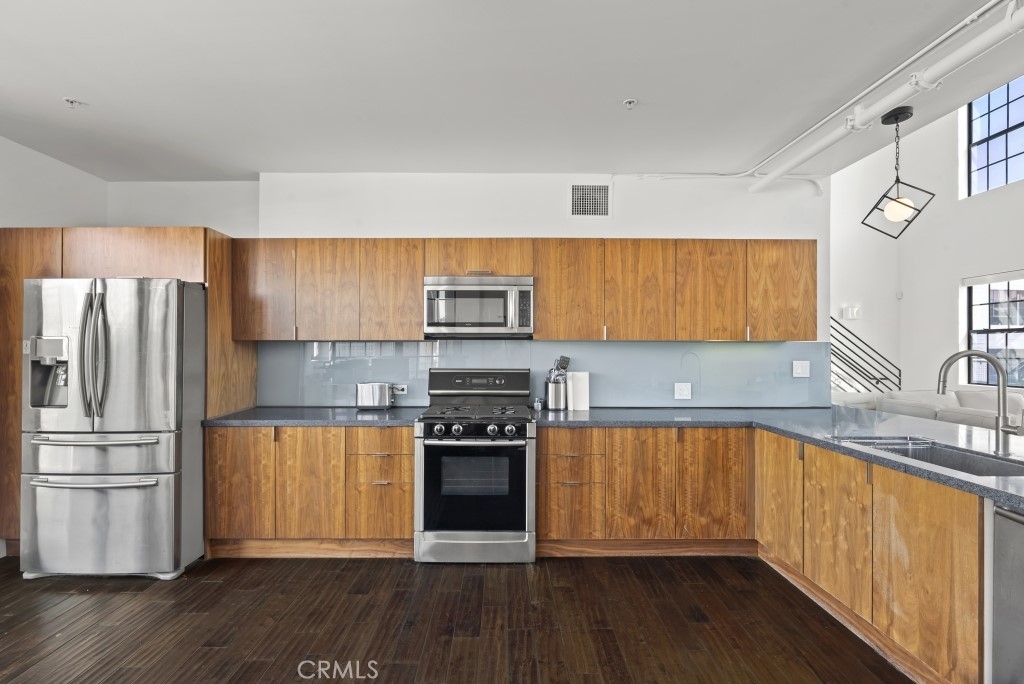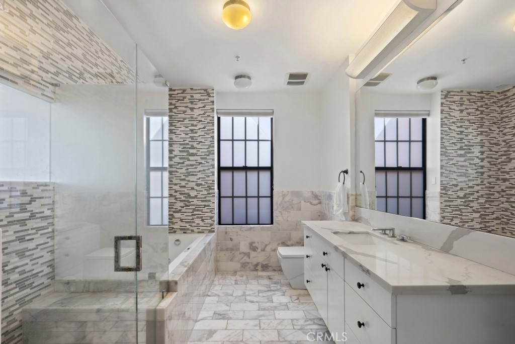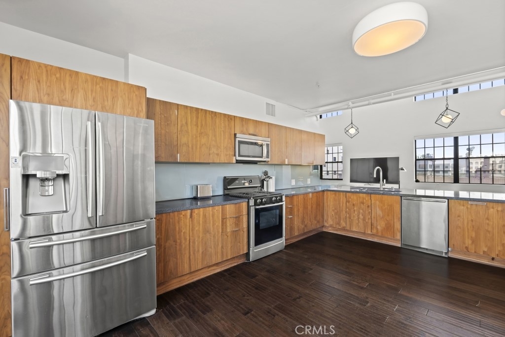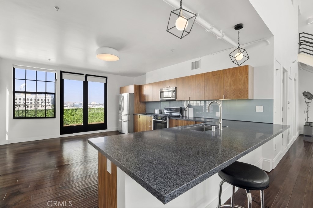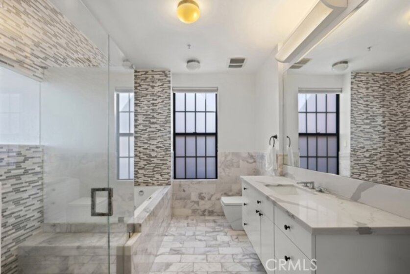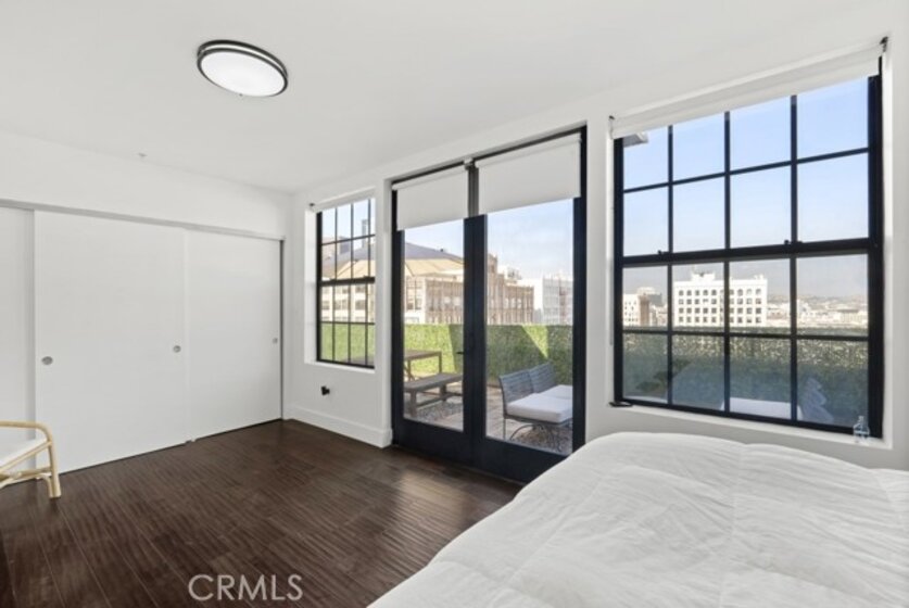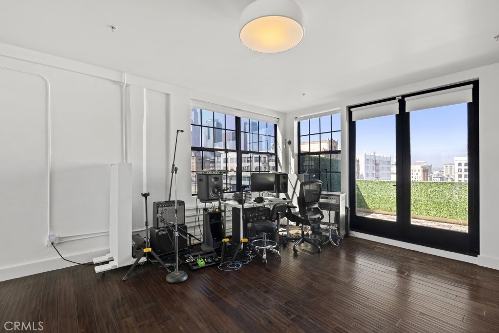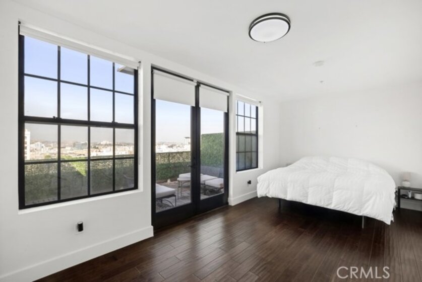 Two-story rooftop penthouse with 20 foot vaulted ceilings and panoramic views from every window of the downtown skylines, San Gabriel Mountains and Palos Verdes. With two private outdoor terraces, accessible from the kitchen and from both bedrooms. Building amenities include a 24-hour courtesy patrol and controlled access underground parking with your own 2 car parking space.