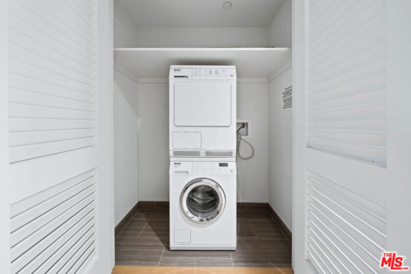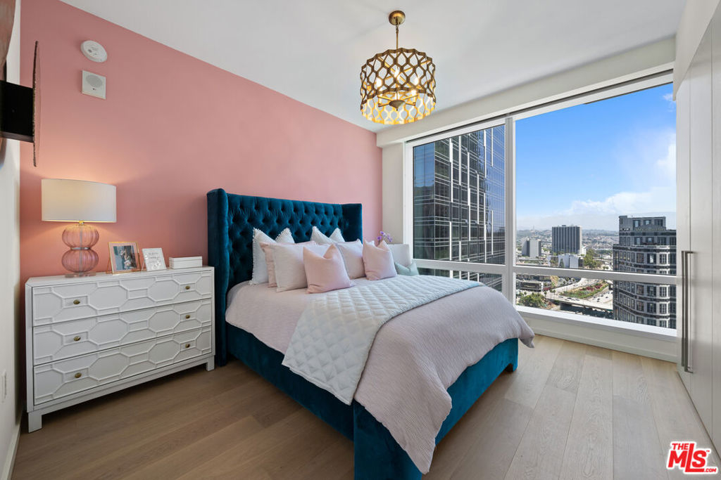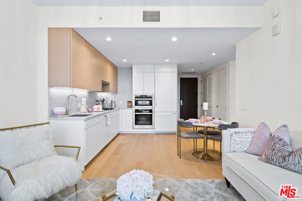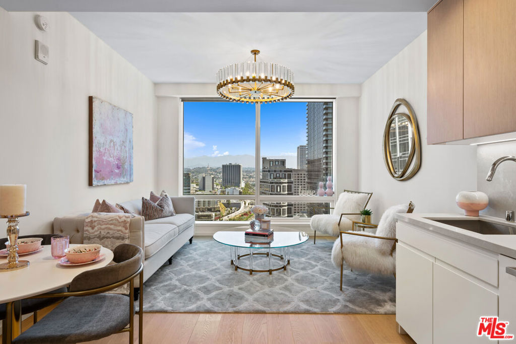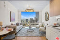 A light-filled living space framed by expansive windows showcasing sweeping city and mountain views. A generous open concept 1BR/1BA with a grand living area and spectacular views. The kitchen features integrated Miele appliances, Caesarstone countertops, and custom Italian cabinetry with LED lighting. Bath includes a custom vanity with Hansgrohe and Duravit fixtures. The open-concept layout flows seamlessly from kitchen to lounge, creating an inviting setting for both entertaining and everyday living including a Nest Learning Thermostat. Soft neutral tones, wide plank flooring, and contemporary finishes elevate the residence with understated sophistication. Metropolis spans an entire city block in vibrant South Park and offers 40,000+ SF of resort-style amenities, including the Met Nine clubhouse, junior Olympic-sized pool and spa, Skypark with fire pit, fitness center with TechnoGym equipment and yoga studios, screening room, business center, dog park, and 24/7 lobby ambassador service. Located moments from Crypto.com Arena, L.A. LIVE, USC, and Dodger Stadium. One-bedroom incentives up to $30,000 available. Portfolio financing available.